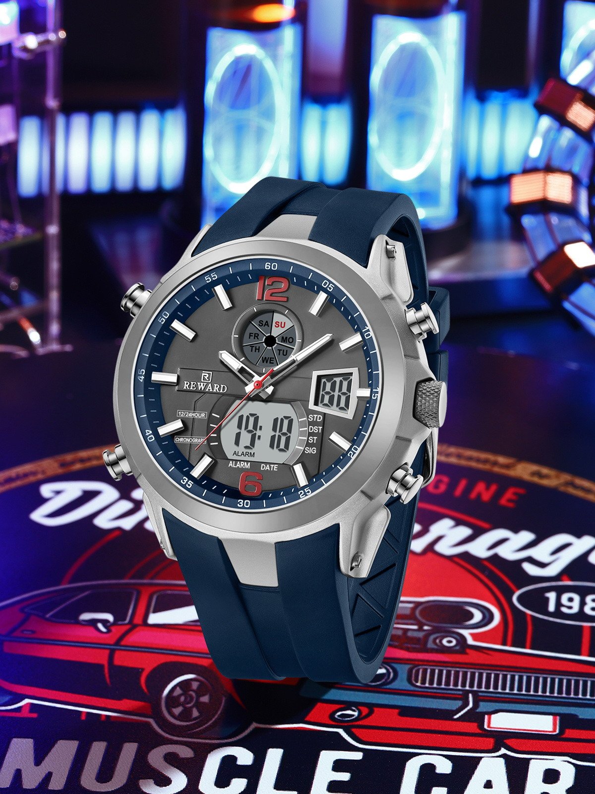 REWARD RD53254M-F Men’s Sport Chronograph Quartz Watch Black Case Blue Accents Stainless Steel